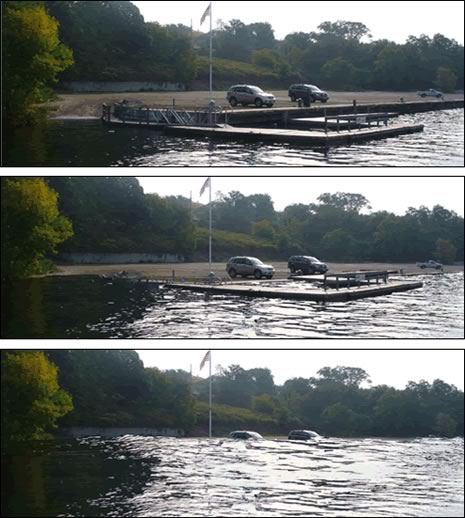This series of visualizations shows simulated views of Rhode Island’s State Pier in Pawtucket at high tide, at high tide plus three feet of sea level rise, and at spring tide plus three feet of sea level rise. Images courtesy of Rhode Island Sea Grant.
