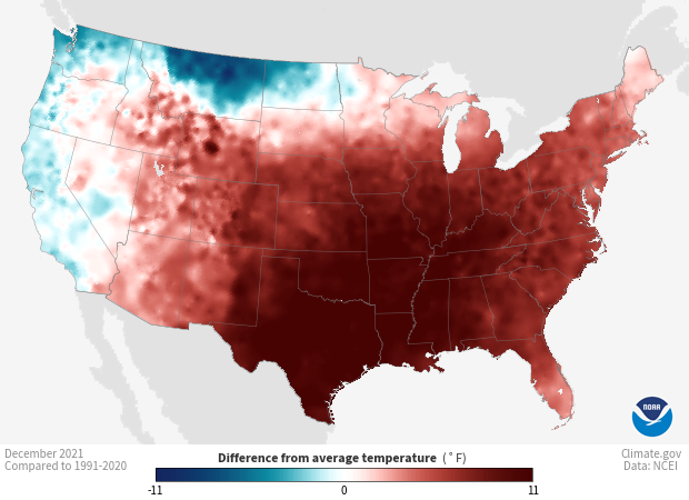 Average temperatures in U.S. climate divisions in January 2022 compared to the 1981-2010 average. Places that were warmer than average are red; places that were cooler than average are blue. NOAA Climate.gov map from our Data Snapshots collection, based on data from NOAA National Centers for Environmental Information.