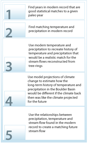 The research team used a step-by-step process to combine paleoclimate information and model projections of temperature and precipitation. The end result was a reconstruction of streamflow imposed upon the climate variability projected for the future. This future streamflow record was essential for Carol to predict how climate variability in the future might affect Boulder’s water supply.