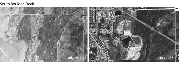 These two aerial images show housing developments expanding along the floodplain of South Boulder Creek during a 50-year period. In the first image on the left, taken in July 1937 by U.S. Forest Service aerial survey crews, some agriculture is evident in the broad floodplain, but little housing. The image on the right shows new housing developments and U.S. 36 running diagonally through the image. (Credit: U.S. Forest Service photos courtesy of the Boulder Area Sustainability Information Network.)