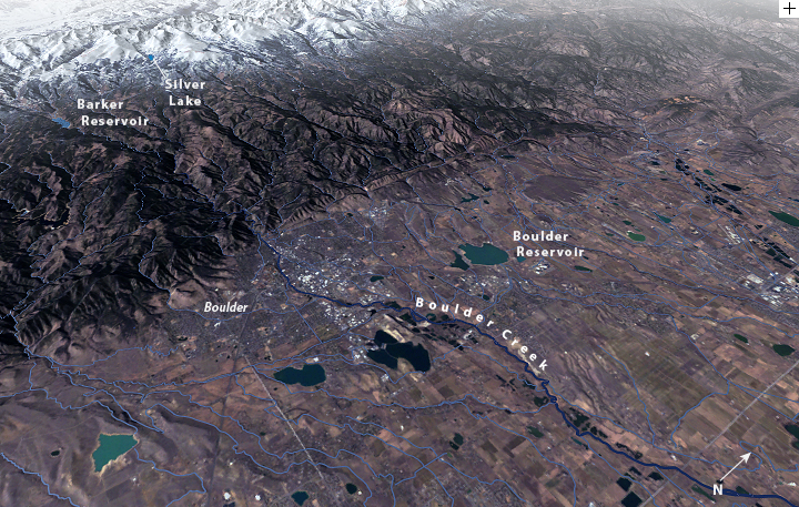 Boulder is located at the base of the foothills of the Rocky Mountains at an elevation of 5,430 feet (1,655 m). On average from year to year, the city’s annual water supply comes from Barker Reservoir on Middle Boulder Creek, Silver Lake/Lakewood Watershed on North Boulder Creek, and the Boulder Reservoir. (Map by Hunter Allen, using elevation data from USGS, GIS layers for Boulder County, and Landsat imagery from March 2009.)