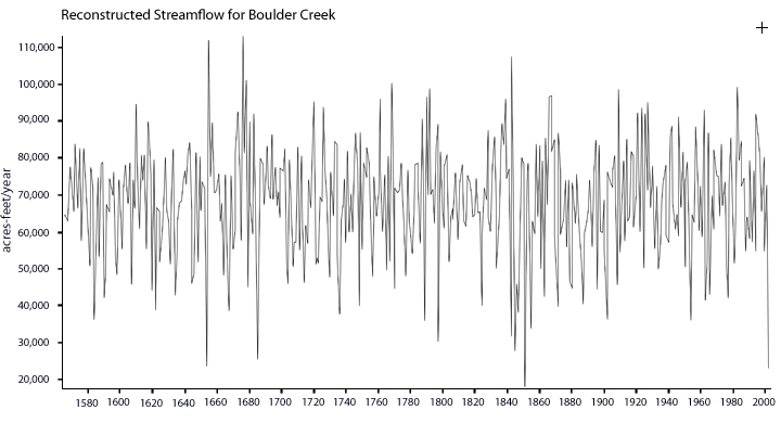 In 2000, Ellinghouse hired Lee Rozaklis and his team of water resource consultants at AMEC, an environmental consulting firm (formerly known as Hydrosphere Resources Consultants, Inc.) to collaborate with the City of Boulder on a study that would examine the city’s drought vulnerability to a repeat of the past 300 years of climate variability. They also worked with Connie Woodhouse at the University of Arizona, who used tree ring data to reconstruct Boulder Creek stream flows back to 1703. (A few years later, this record was extended to cover 1566-2003.)