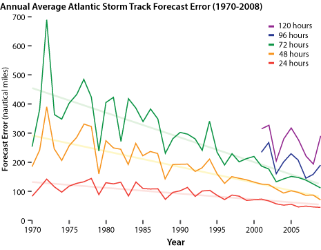 The National Hurricane Center issues official forecasts of a storm’s center and other parameters every six hours. Track error is calculated after the storm by measuring the distance between a cyclone’s forecast position and its actual position at the forecast verification time. This graph shows how annual average track errors for Atlantic basin tropical storms and hurricanes have changed from 1970-2009.