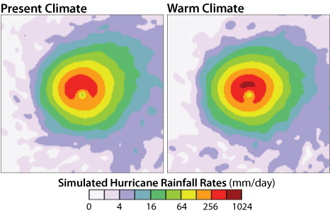 According to climate model projections, tropical cyclone rain rates within 62 miles (100 km) of the storm’s center are likely to increase by 20 percent over the next century. Images from computer simulation courtesy of Tom Knutson, NOAA GFDL.