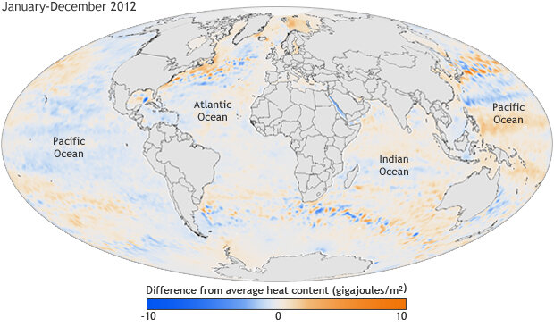 Heat content in the upper 2,300 feet, or a little less than one-half mile, of the ocean remained near record high levels in 2012. The upper ocean held more heat than average in most of the major ocean basins visible on the map above, with the exception of the Pacific Ocean. A short-lived La Niña in early 2012 left a mark of slightly cooler upper ocean temperatures in the eastern Pacific and western Indian oceans. This was mirrored by warm temperatures in the western tropical Pacific and eastern tropical Indian Ocean.