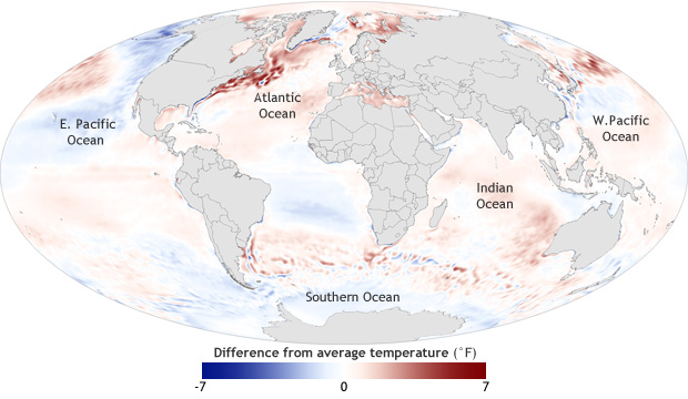 Sea surface temperature in 2012 compared to the 1981-2010 average, based on data from NOAA National Climatic Data Center. The dark red and blue areas reveal areas of the global ocean that were up to 7º Fahrenheit warmer or cooler than average.
