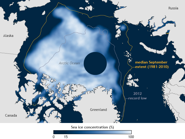 Sea ice extent in the Arctic plays a critical role in the Earth system. Physically, its white surface reflects up to 80 percent of incoming sunlight during the long days of Northern Hemisphere summer, exerting a cooling influence on the climate. Plus, polar bears, walruses, and whales rely on the presence of sea ice to preserve their hunting, breeding, and migrating habits. Additionally, less ice means more Arctic shipping and exploration, with major implications for the world economy and national security.