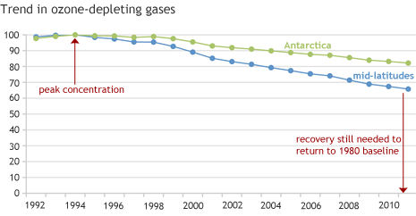 Concentrations of ozone-depleting gases in the stratosphere have declined in recent decades. NOAA indexes each year’s gas concentration relative to the peak concentration of harmful gases (100) and the baseline concentration of 1980 (0). Graph based on data provided by Stephen Montzka, NOAA Earth System Research Laboratory, Global Monitoring Division.