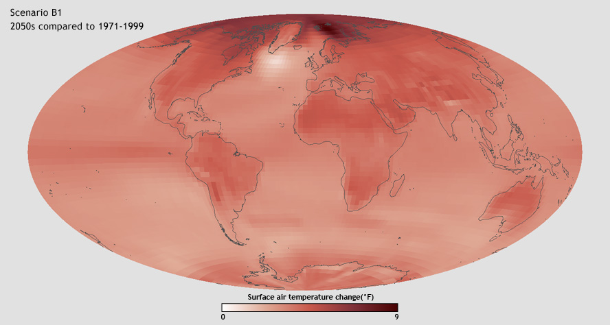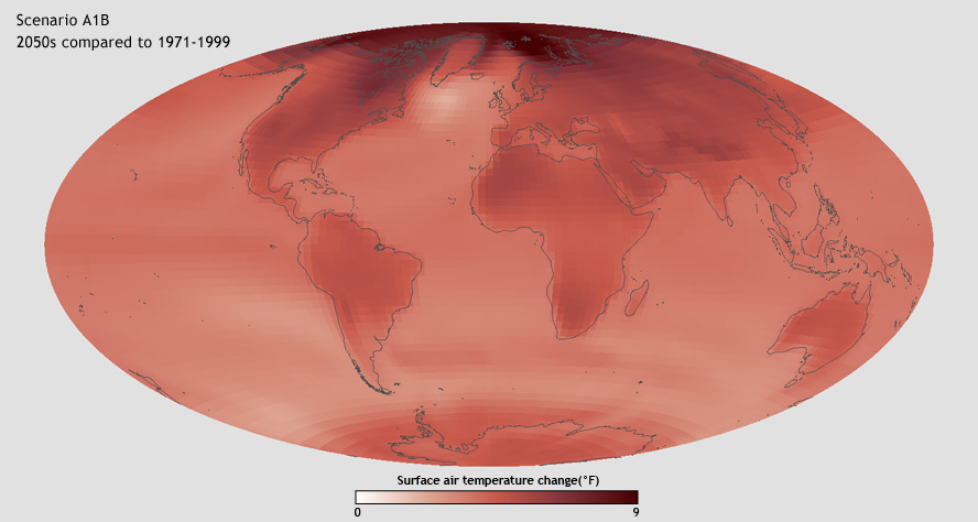 These maps show the average of a set of climate model experiments projecting changes in surface temperature for the period 2050-2059, relative to the period from 1971-1999. The top left map corresponds with the green trend line above (IPCC scenario A1B); the top right map matches the red trend line above (IPCC scenario A2); and the bottom left map matches the blue trend line (IPCC scenario B1). All models project some warming for all regions, with land areas warming more than oceans. large versions: A1B | A2 | B1 (Maps by Ned Gardiner, Hunter Allen, and Jay Hnilo, CICS-NC, using data courtesy the Coupled Model Intercomparison Project, or CMIP3.)