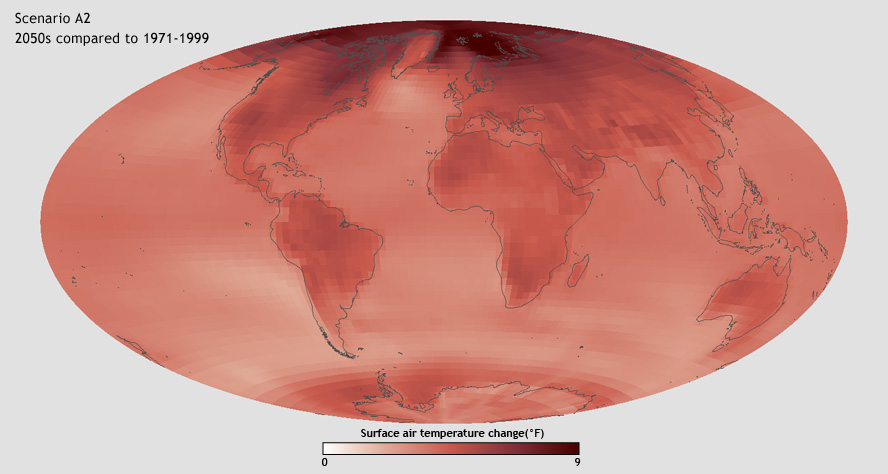 Editor's note: 13 May, 2022. This page is out of date. It's being left online to preserve the link in case this page was cited by as a reference. More recent projections of future climate are available in Chapter 4 of the Intergovernmental Panel on Climate Change's Sixth Assessment Report and as an interactive atlas. Your can view projections that have been downscaled to local areas in the Climate Explorer, part of the U.S. Climate Resilience Toolkit.