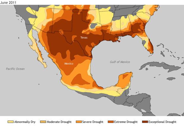 Further demonstrating the ability of La Niña to tip a region’s climate toward its natural extremes, La Niña likely contributed to the continuation of historic drought in northern Mexico and the southern United States in 2011. In some parts of Texas, New Mexico, Oklahoma, and Louisiana summer heat conspired with the exceptional dryness to break records for cumulative drought impacts on water storage, including reservoirs and ground water. Across the border, 85 percent of Mexico was affected by some level of drought in June, and the country suffered its worst forest fire season in history, with an estimated 2.4 million acres burned.