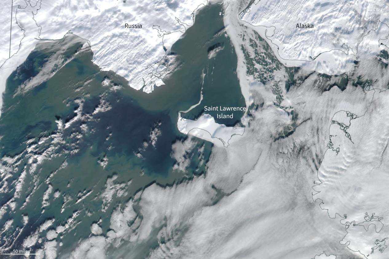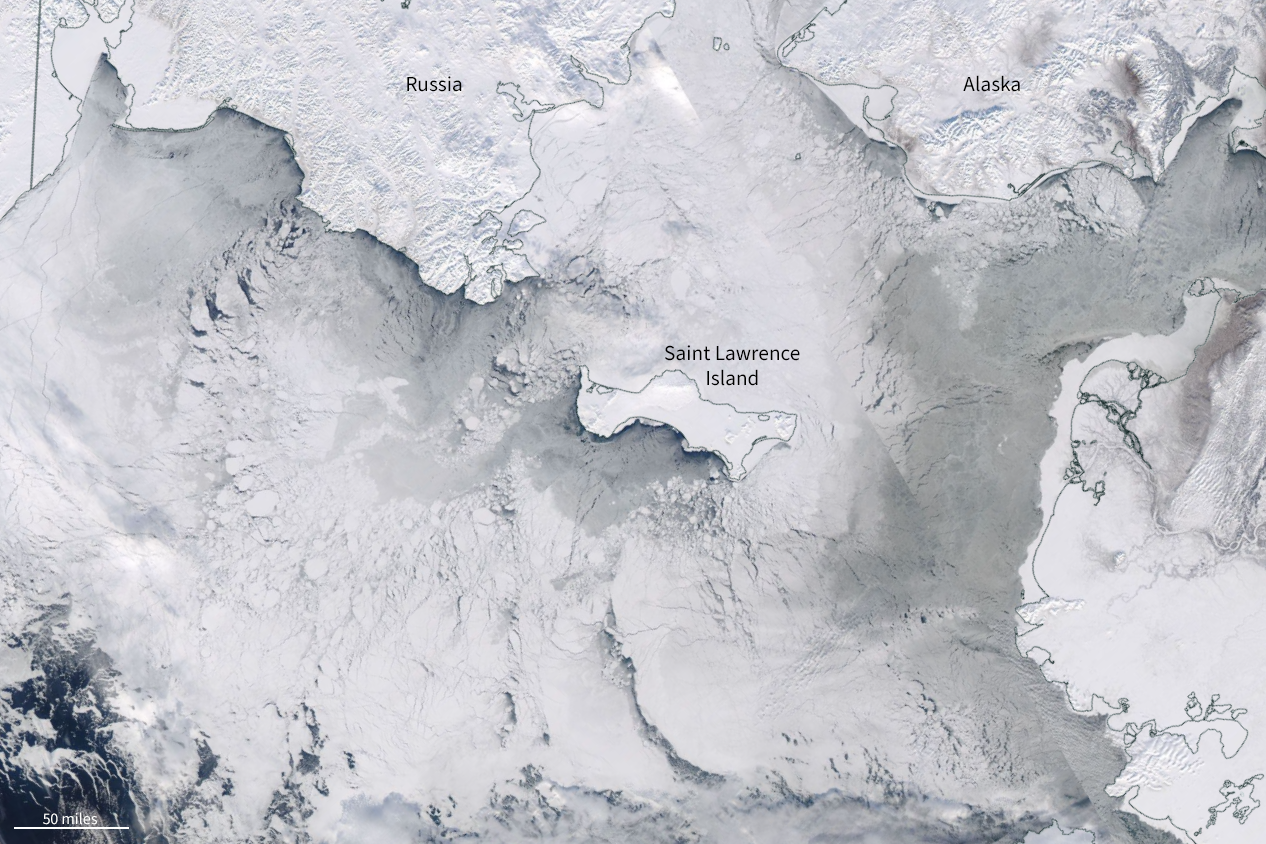 (Click and drag slider to compare.) In the Bering Sea, Saint Lawrence Island has already experienced an ice-free winter. The right image shows ice-free waters in February 2018. The left image shows the same area in 2007, with the island engulfed in sea ice. Satellite images from NASA Terra MODIS (left) and NASA/NOAA Suomi VIIRS (right).