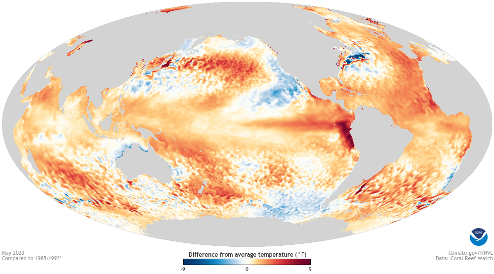 Sea surface temperatures around the world in May 2023 compared to the long-term average. Most of the global ocean was warmer than average, leading to a new record-warm global ocean temperature for the month of May. Intense warmth along the equator in the eastern pacific was a sign of the arrival of El Niño. Map by NOAA Climate.gov, based on data provided by Coral Reef Watch and processed by NOAA Environmental Visualization Lab.