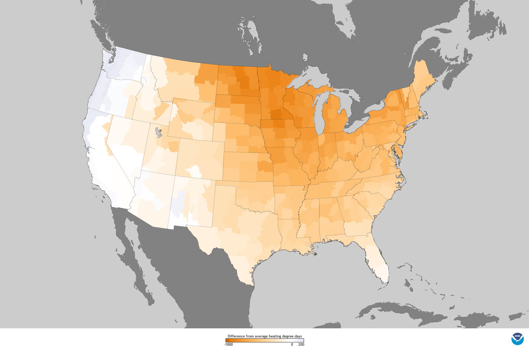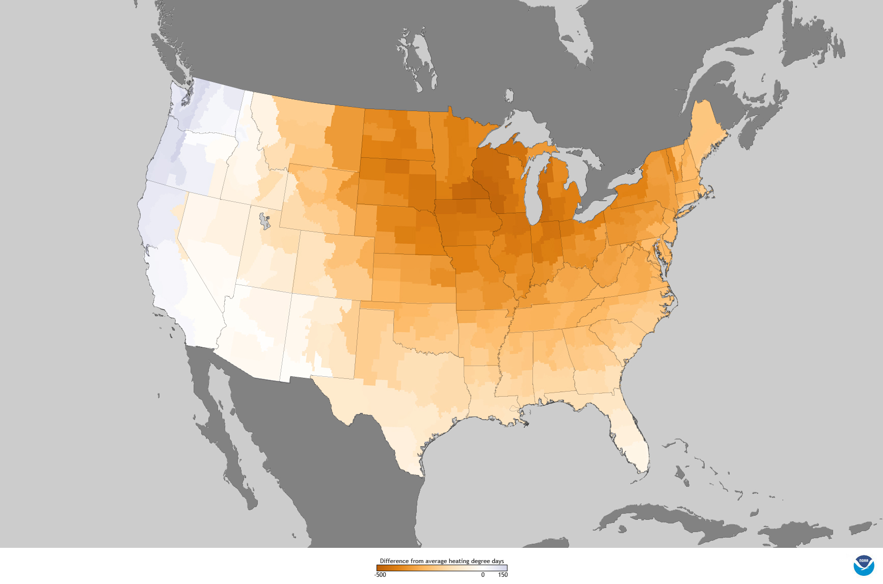 Winter (October 2011-March 2012) heating demand in the U.S compared to the 1981-2010 average heating degree days. Heating degree days describe where daily temperature were above (orange) or below (blue) a 65-degree Fahrenheit baseline. The warmer-than-usual winter meant fewer heating degree days across much of the U.S. Maps by climate.gov team based on data from the National Climatic Data Center. large maps: winter | year to date | March 2012