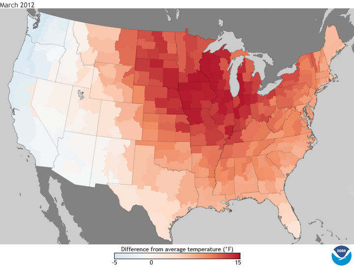 Record and near-record breaking temperatures dominated the eastern two-thirds of the nation and contributed to the warmest March for the contiguous United States since records began in 1895. More than 15,000 warm temperature records were broken during the month. The average temperature of 51.1°F was 8.6 degrees above the 20th century average. In the past 117 years, only one month (January 2006) has ever been so much warmer than its average temperature.