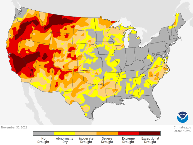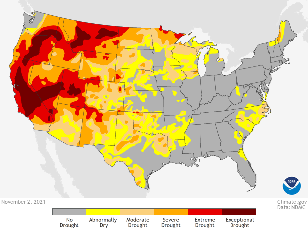Below-average precipitation in November 2021 caused drought to expand across the United States between November 2 (left) and November 30 (right). Maps by NOAA Climate.gov, based on data from the U.S. Drought Monitor project.