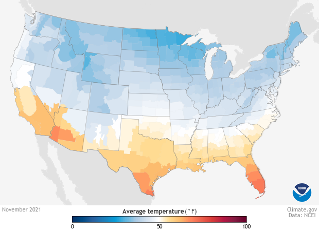 According to the NOAA National Centers for Environmental Information climate summary for November 2021, the average temperature for the contiguous United States was 45.2° Fahrenheit, which is 3.5° F warmer than the 20th-century average. Based on records dating back to 1895, it was the seventh-warmest November on record.