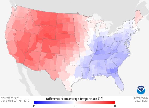 November 2021 temperatures for the Lower 48 U.S. states (left) and how they compared to the 1981-2010 average (right). NOAA Climate.gov images from Data Snapshots, based on data from NOAA NCEI.