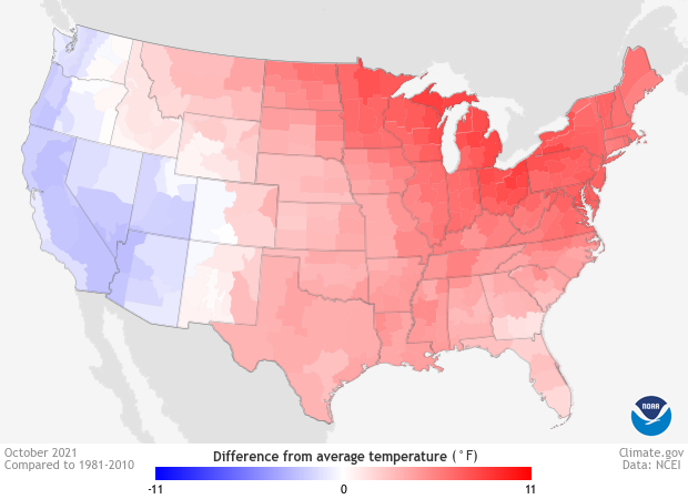 Temperature across the contiguous United States in October 2021 compared to the 1981-2010 average. Places that were warmer than average are red; places that were cooler than average are blue. NOAA Climate.gov map based on data from NOAA's National Centers for Environmental Information.