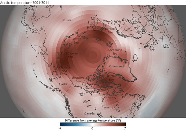 Difference from average temperature over the Arctic from 2001 through 2012, compared to the average from 1970-2000. The absence of negative anomalies is a manifestation of “Arctic amplification” of climate change. Temperature increases in the Arctic are more than double the warming observed at lower latitudes. Map by climate.gov team, based on NOAA ESRL reanalysis data.