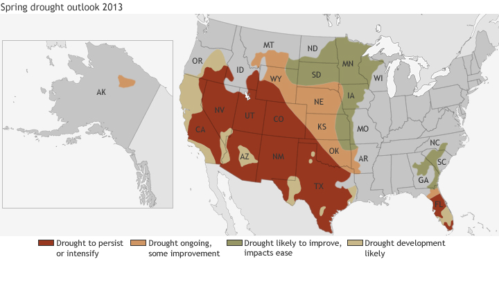 The map above shows the drought outlook for March 21 through June 30, 2013. Areas where drought is likely to persist or worsen are shown in reddish-brown. Areas of tan indicate where drought is likely to see some improvement, and areas where drought is likely to improve and its impacts ease are shown in green. Yellow indicates places where drought conditions are likely to develop.