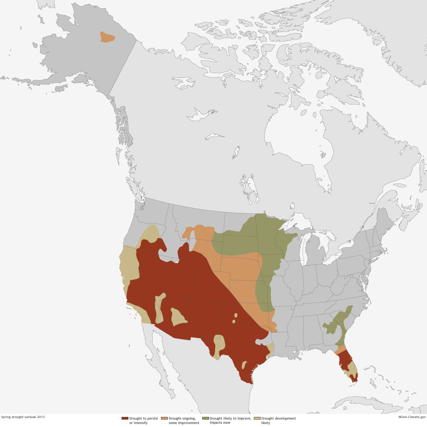 NOAA’s Climate Prediction Center released its Spring Outlook on March 21. The big story for the upcoming spring: relief for many drought-stricken areas of the United States is not likely.