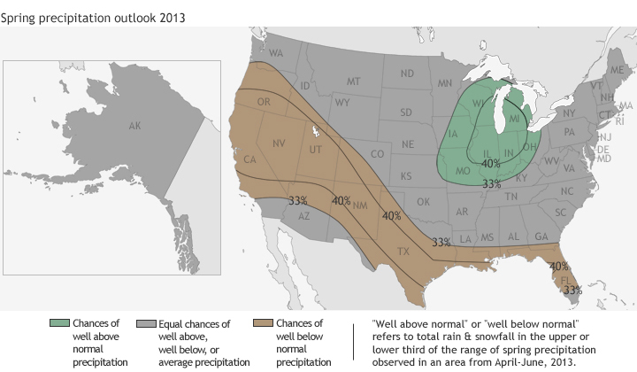 In the case of these forecasts, “well above average” and “well below average” refer to temperature or precipitation in the upper or lower third of the range of climate conditions observed in an area from 1981-2010. The outlooks are more confident in some places than they are in others; the lines trace the boundaries of different levels of probability. In the video below, Deputy Director of the Climate Prediction Center, Mike Halpert, talks in more depth about the Spring 2013 Climate Outlook.