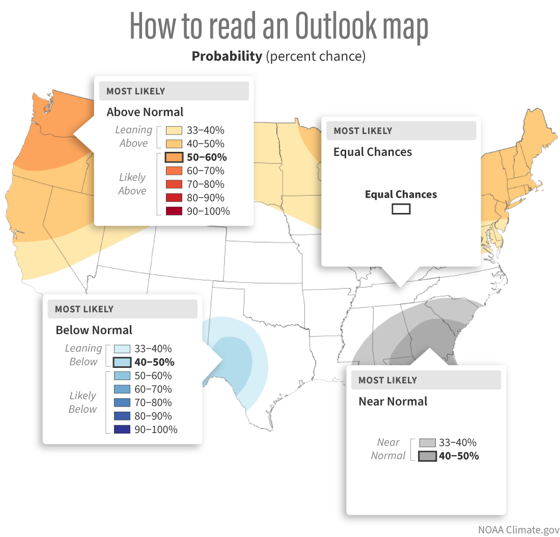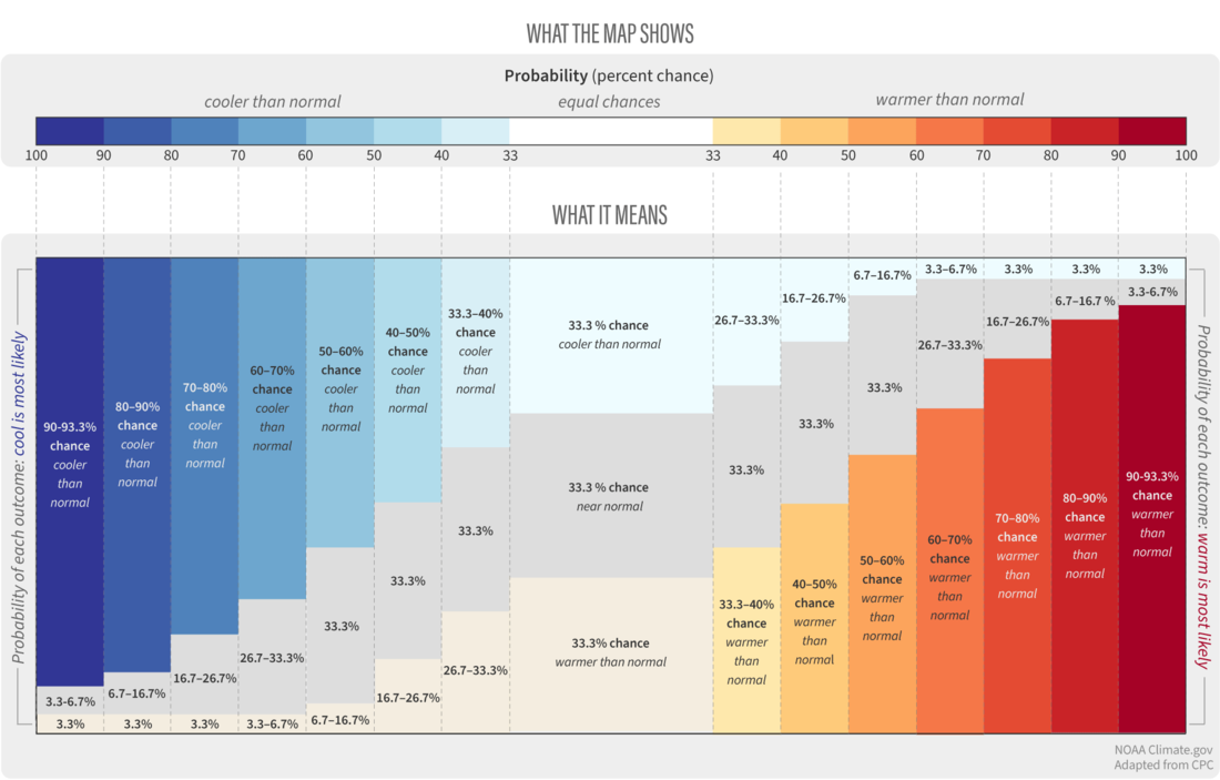 NOAA’s monthly and seasonal climate outlooks do not predict the actual temperature or precipitation amounts for upcoming months or seasons. Instead, they predict the probability (percent chance) that upcoming monthly or seasonal average temperature or precipitation will fall in the top third, middle third, or bottom third of the climate record at a given place. Currently, the climate record spans 1991-2020. For simplicity, we refer to those categories as well above normal, near normal, or well below normal. The colors on the outlook maps show which of the three is most likely.