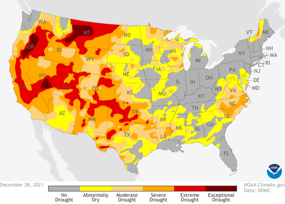 Grab and drag the slider to compare drought status across the contiguous United States as of December 28, 2021 (left), to projected drought conditions in January 2022 (right). The main area of improvement is across the Pacific Northwest. NOAA Climate.gov images, based on data from the U.S. Drought Monitor Project and the Climate Prediction Center.