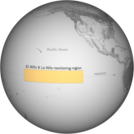 For real-time La Niña/El Niño tracking, NOAA watches for temperature anomalies in the central tropical Pacific (between 5° north and south latitude and 120° to 170° west longitude). Map by Climate.gov team, adapted from original by the NOAA Climate Prediction Center.