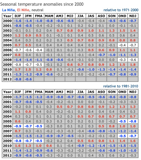 In the last version of the table, all the temperature anomalies were based on the 1971-2000 average, which was relatively cool compared to the past three decades. Against that background, some periods of cooler-than-average temperatures (from late 2005 to early 2006 and from late 2008 through early 2009) were not quite cold enough for long enough to qualify as an official La Niña episode.