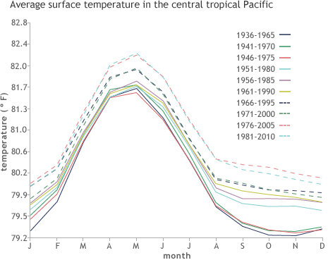 The average monthly temperatures in the central tropical Pacific have been increasing. This graph shows the new 30-year averages that NOAA is using to calculate the relative strength of historic El Niño and La Niña events. Graph adapted by Climate.gov team from original by the NOAA Climate Prediction Center.