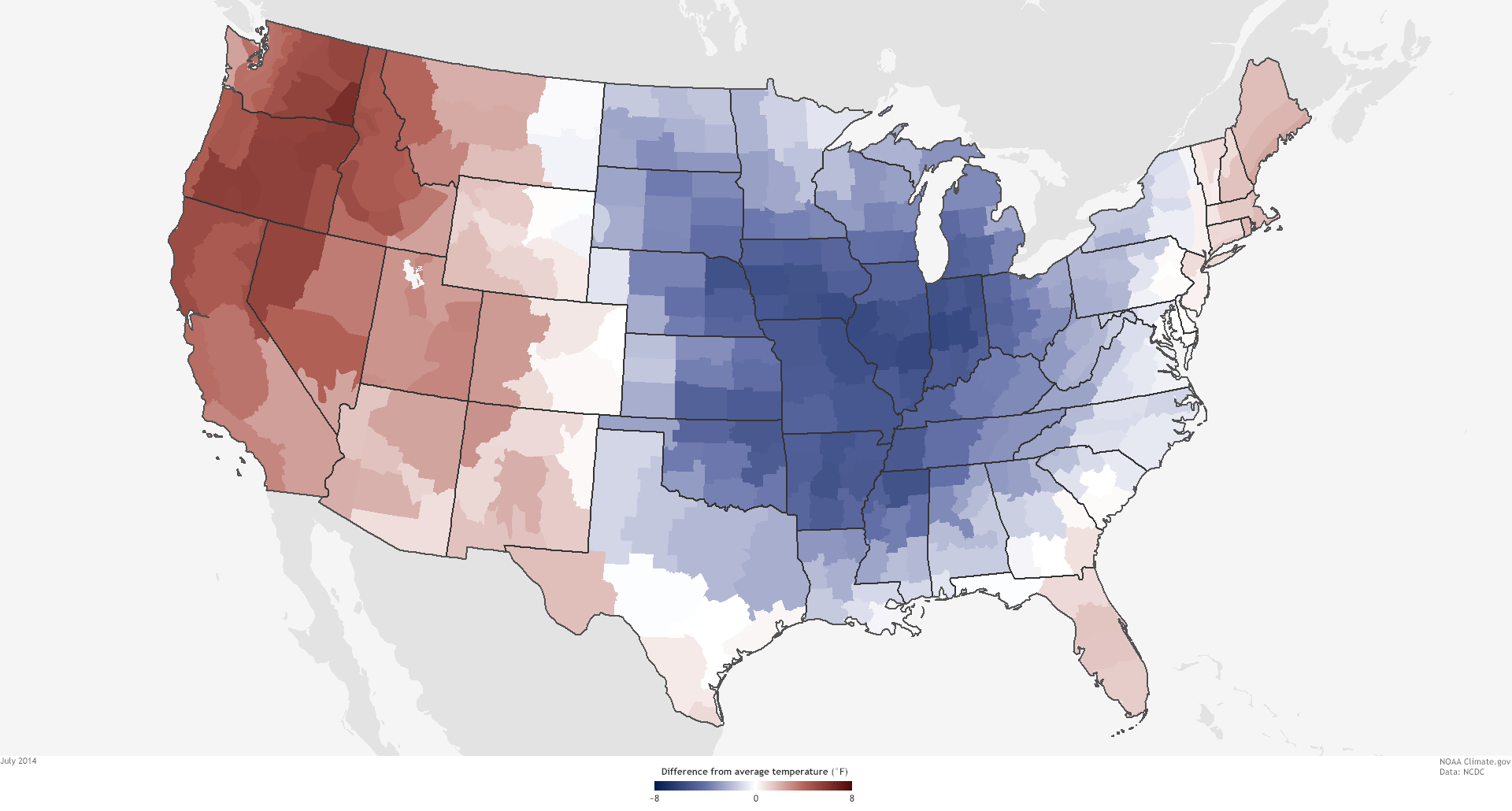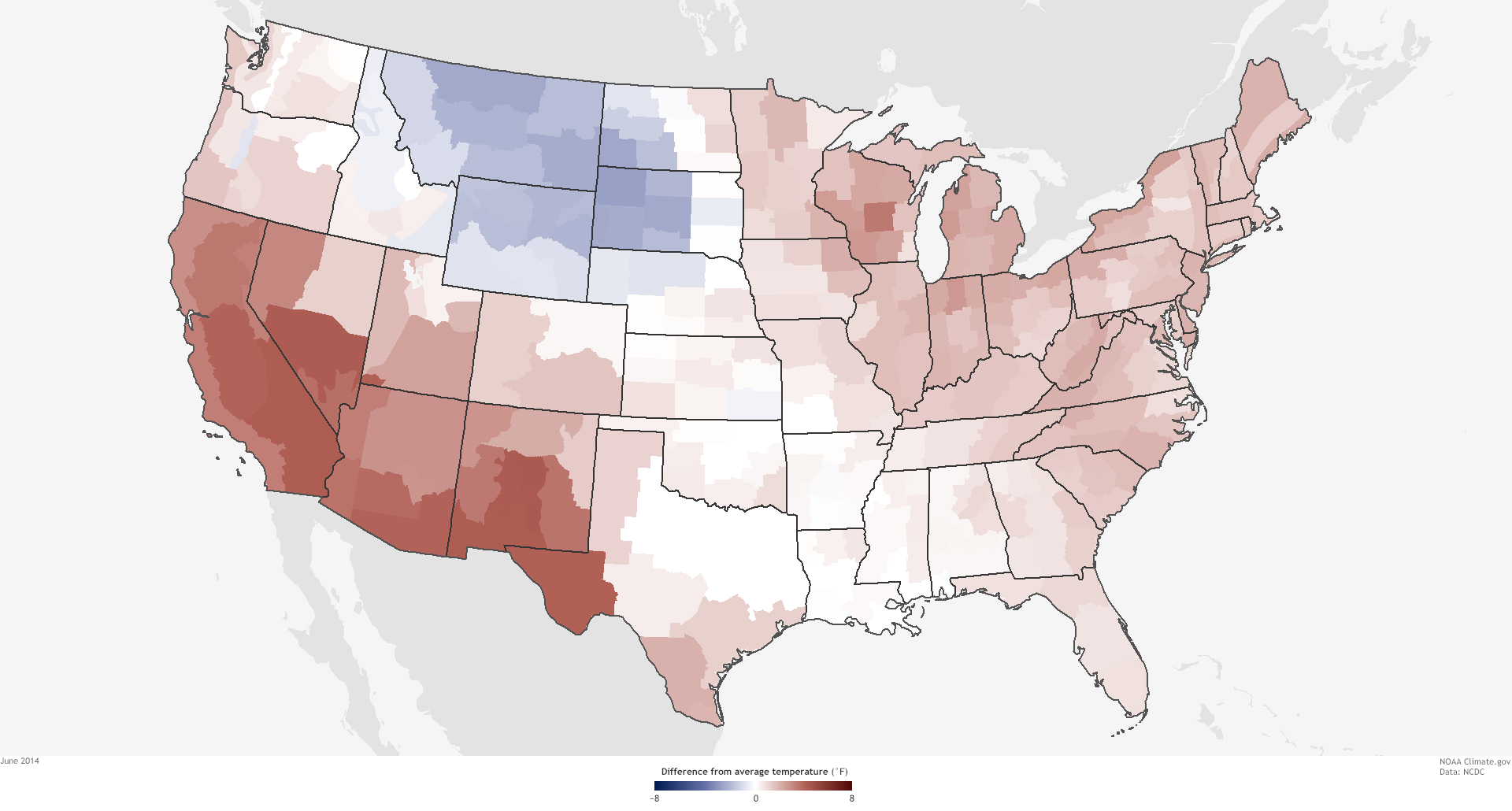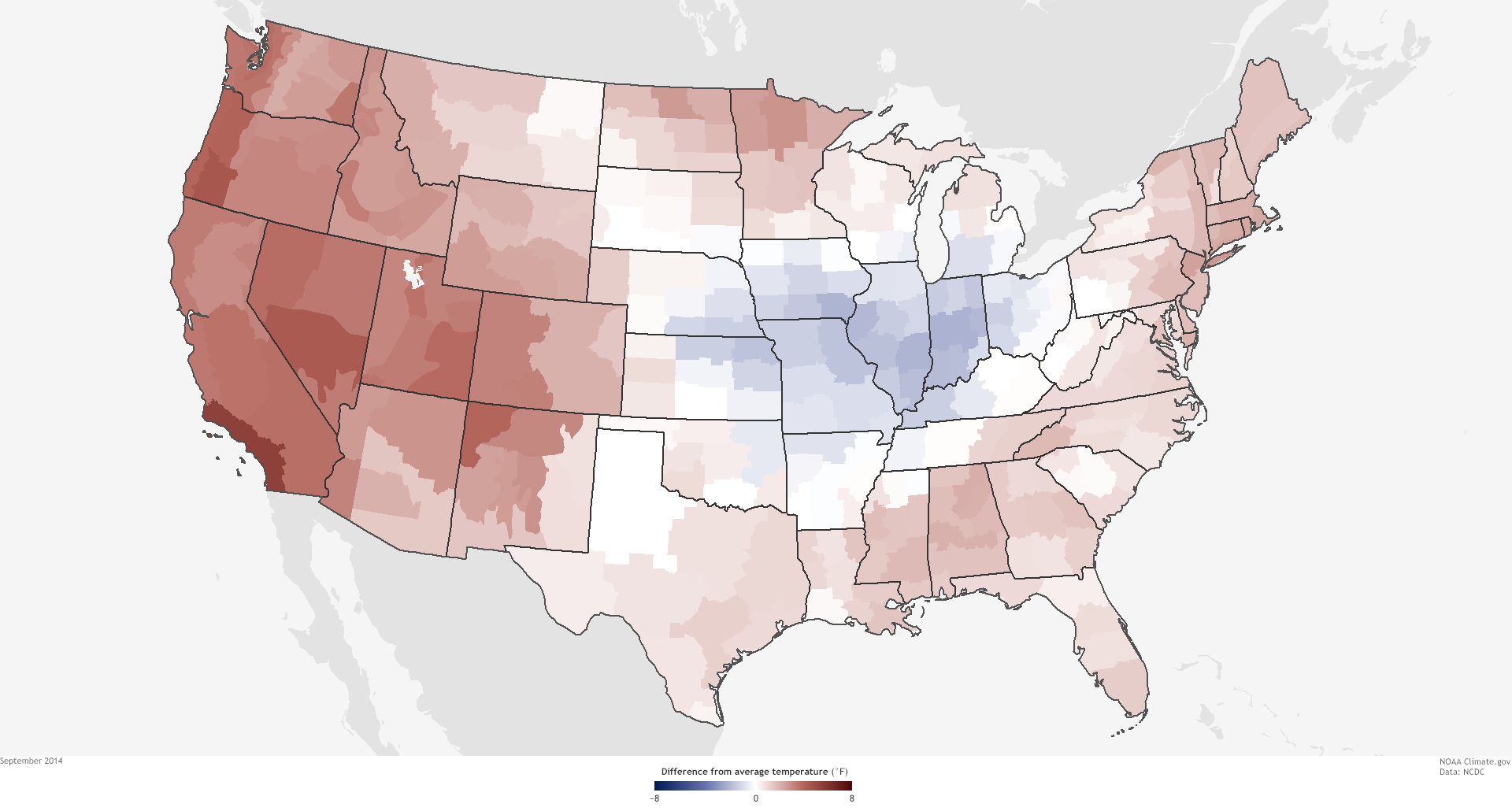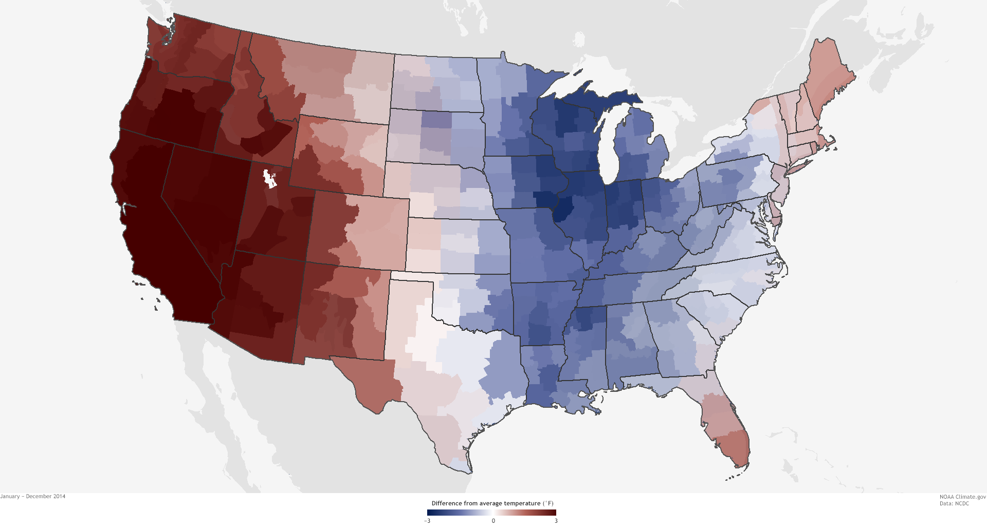 The Lower 48 United States was 0.5°F above average in 2014, making it the thirty-fourth warmest year in the historical record (1895-2014). Nine states across the West had a top-10-warmest year, while seven states across the Midwest and Mississippi Valley had a top-10-coolest year.