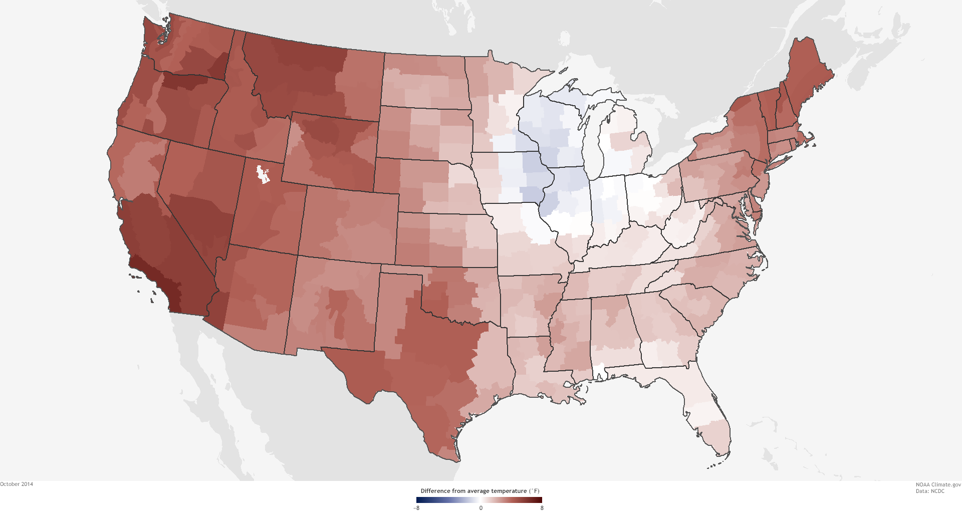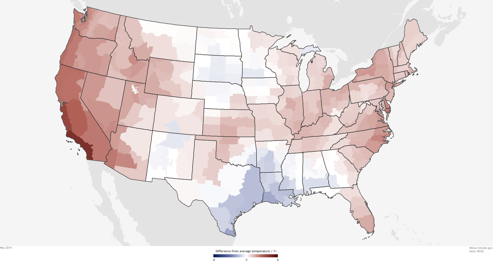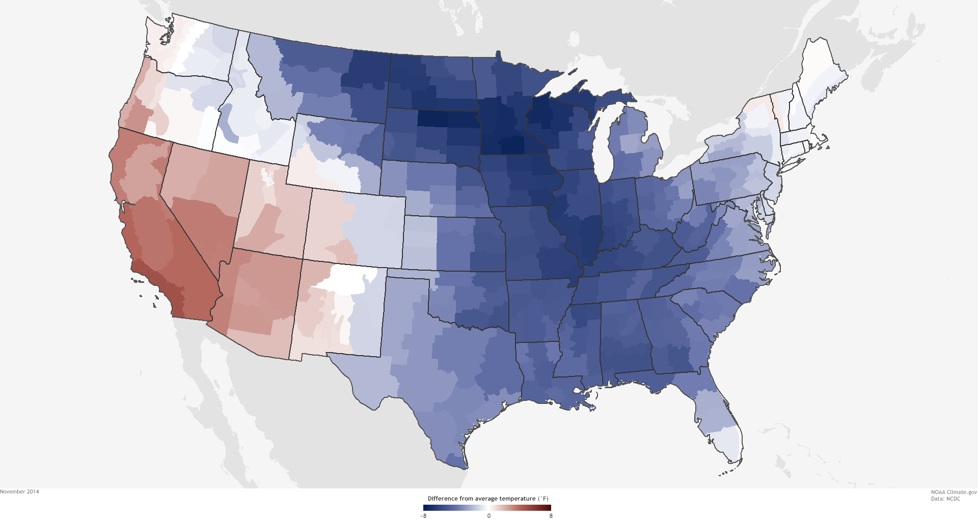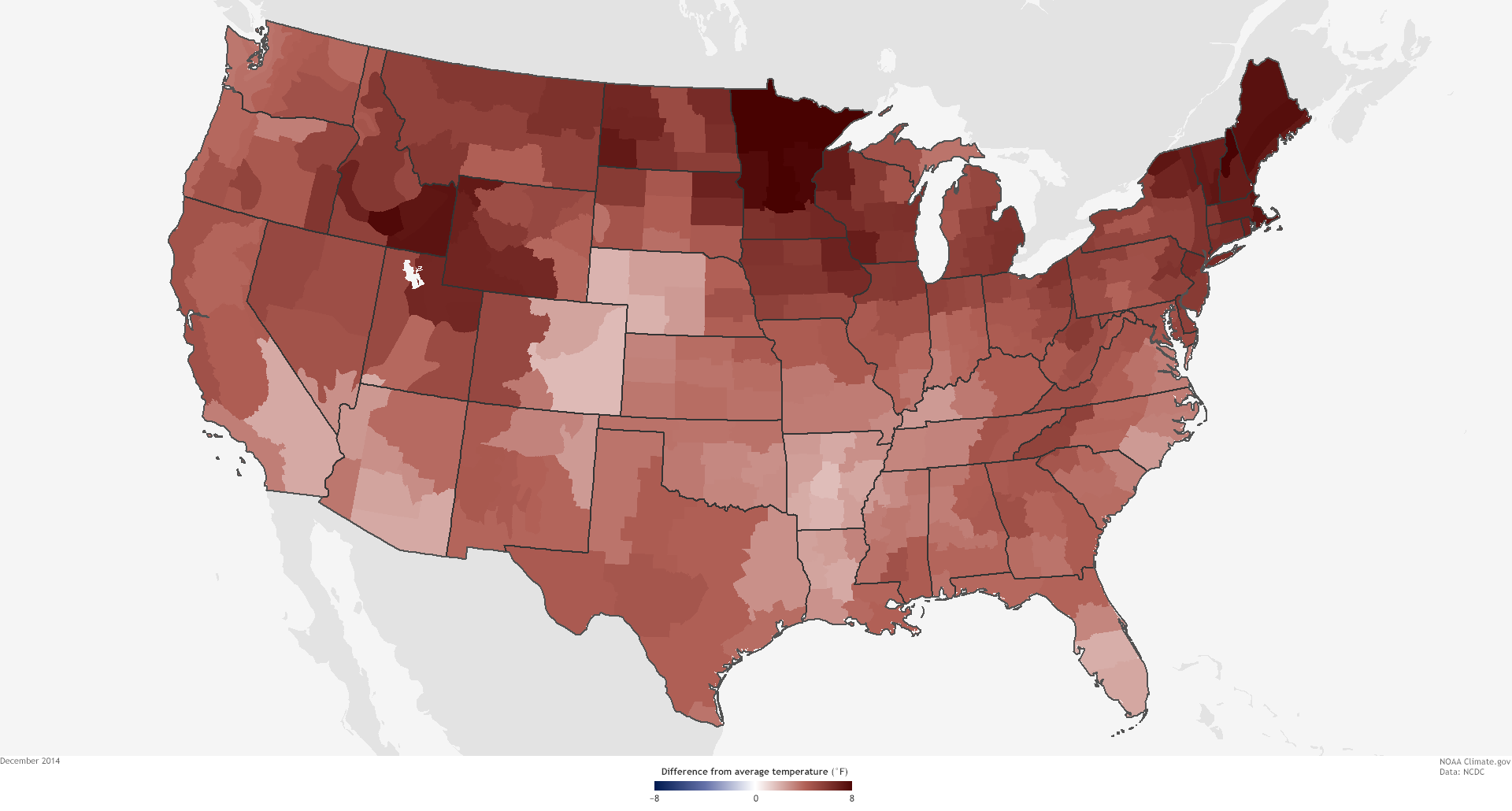 The Lower 48 United States was 0.5°F above average in 2014, making it the thirty-fourth warmest year in the historical record (1895-2014). Nine states across the West had a top-10-warmest year, while seven states across the Midwest and Mississippi Valley had a top-10-coolest year.
