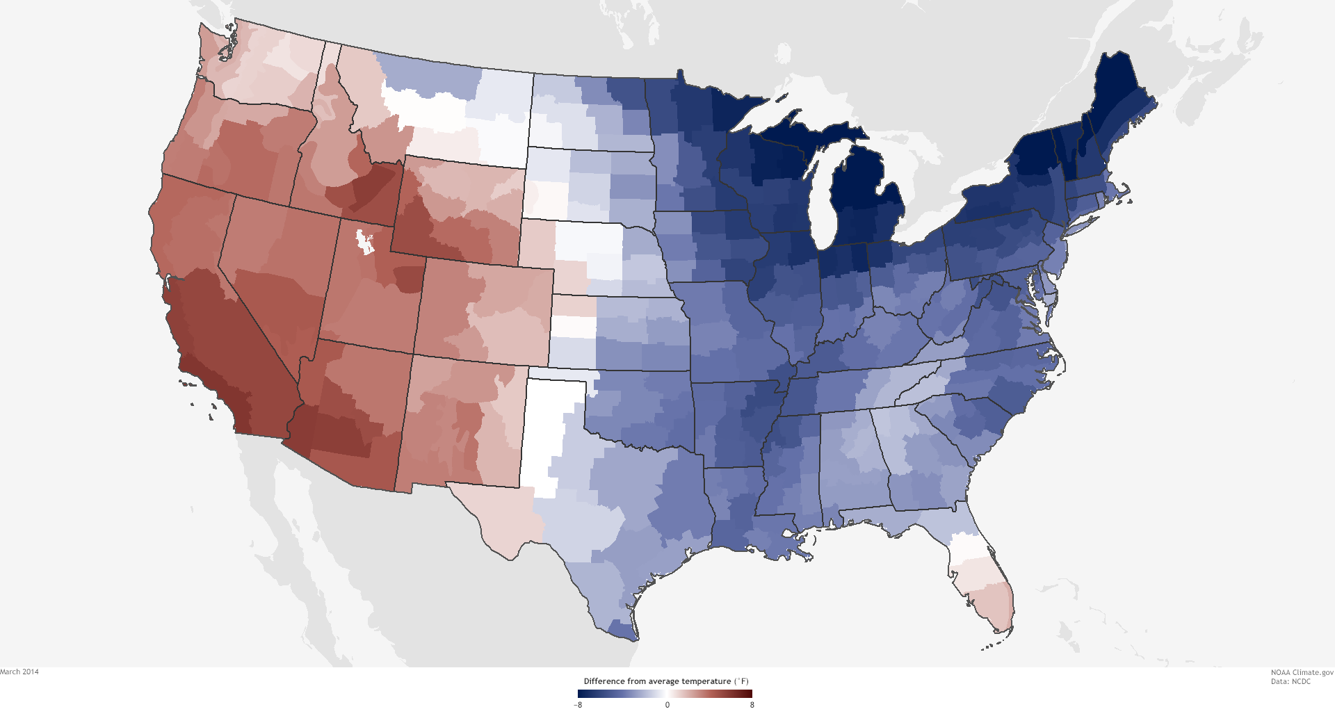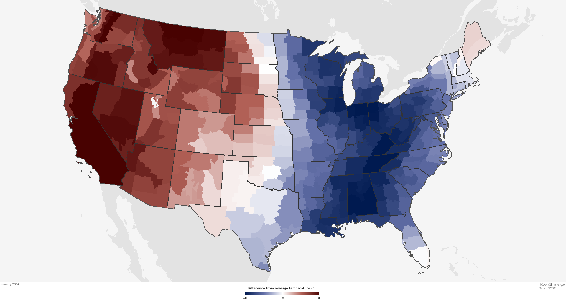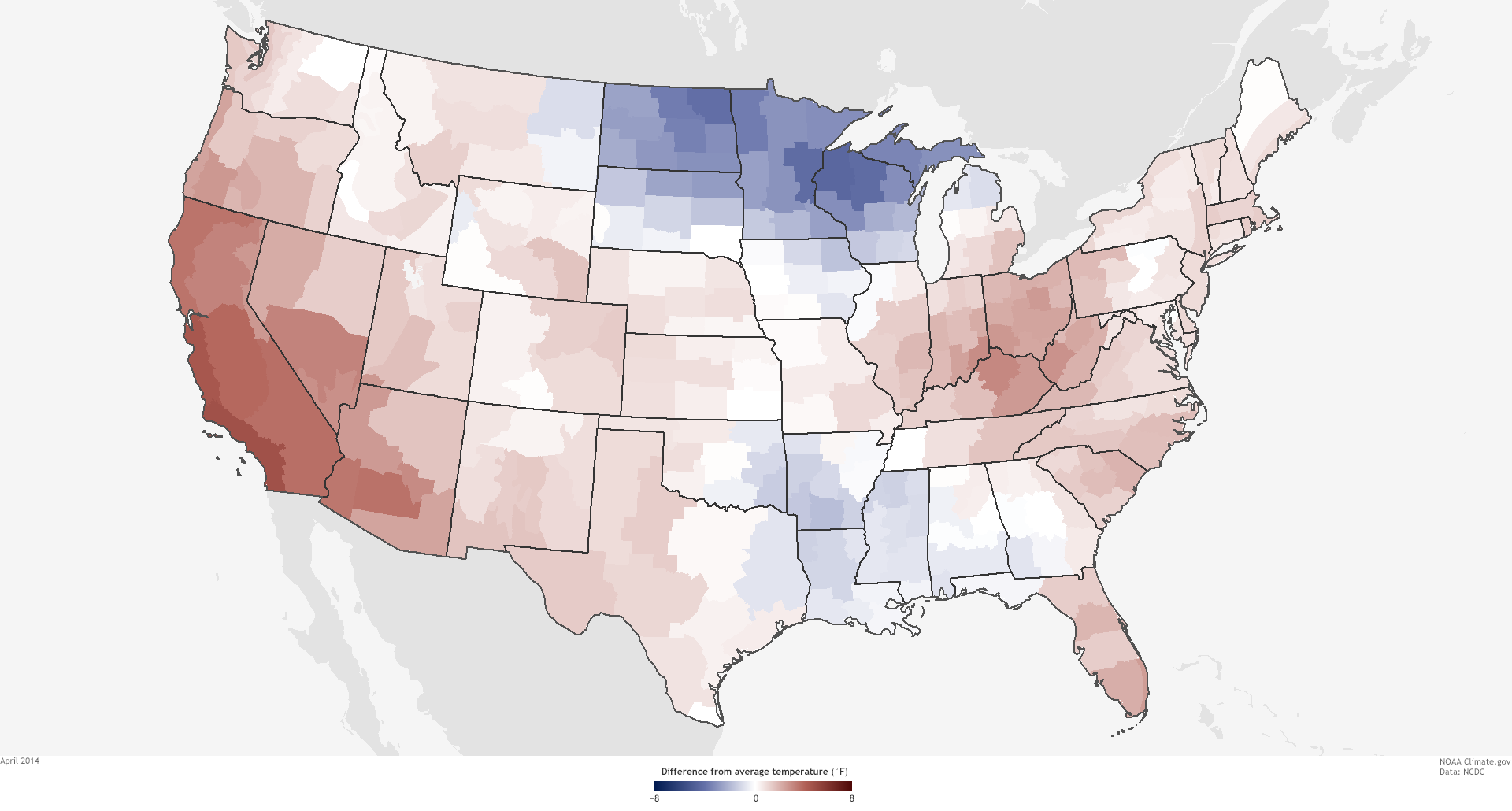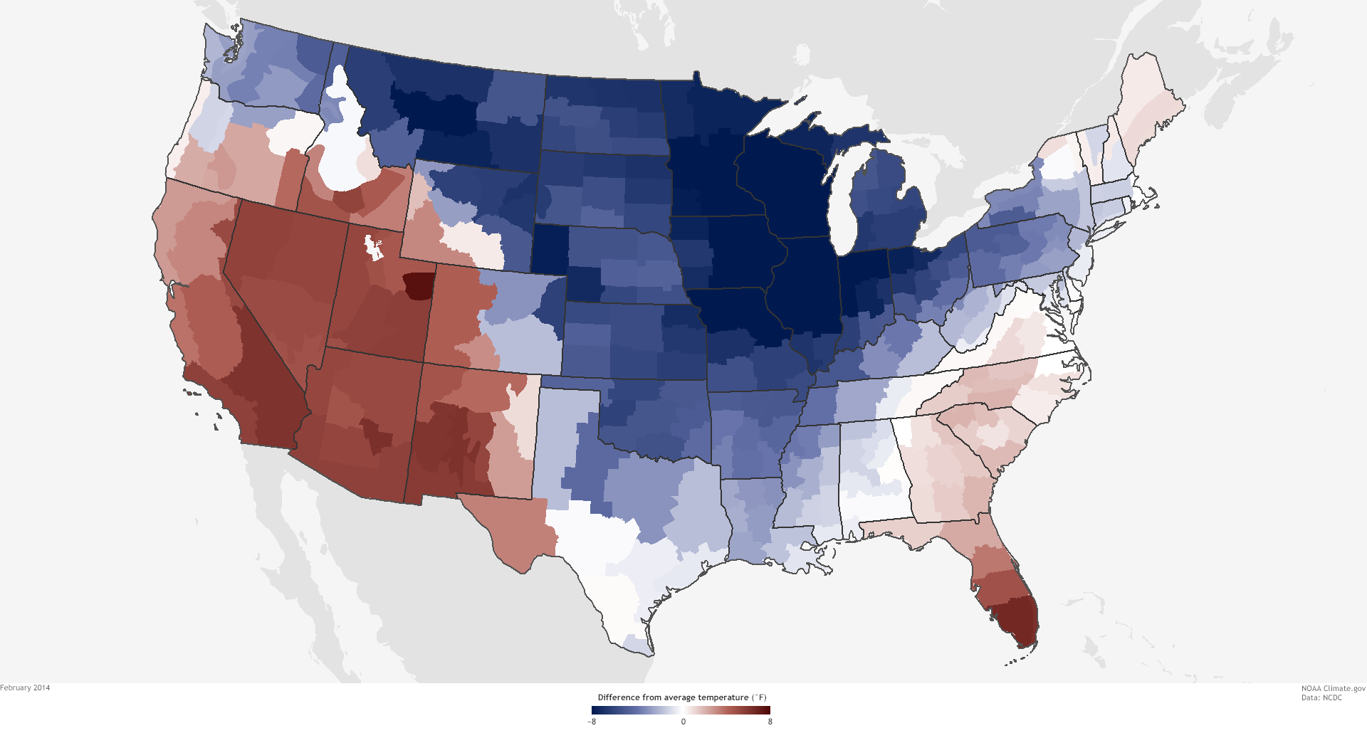 The Lower 48 United States was 0.5°F above average in 2014, making it the thirty-fourth warmest year in the historical record (1895-2014). Nine states across the West had a top-10-warmest year, while seven states across the Midwest and Mississippi Valley had a top-10-coolest year.