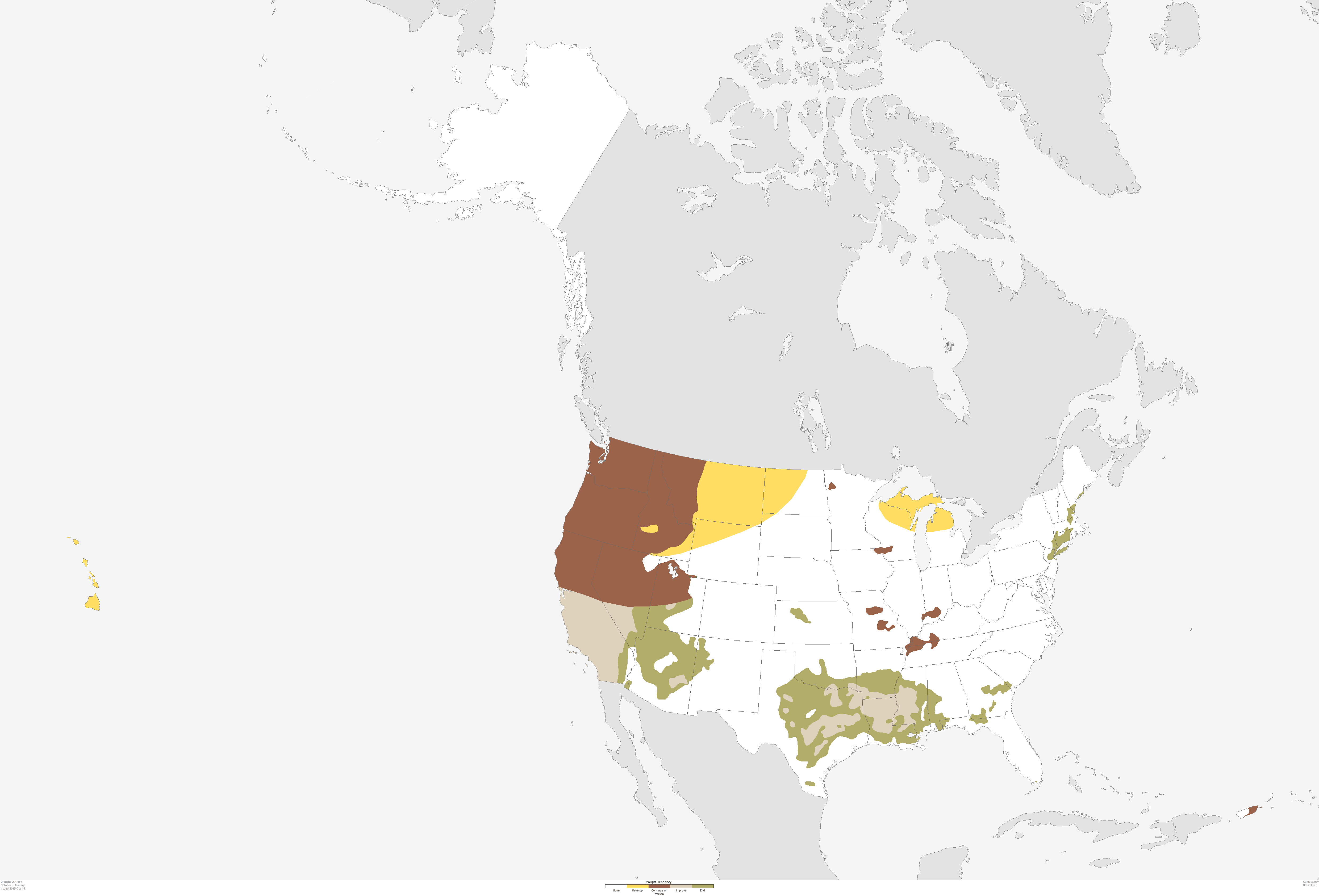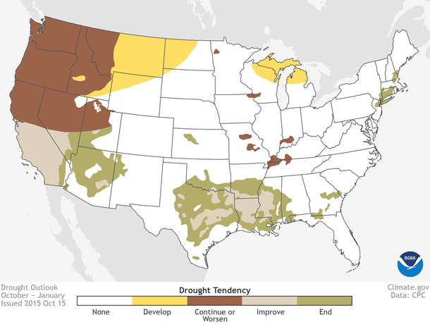 National drought outlook for October 15-January 31, 2016, issued October 15, 2015. Map by NOAA Climate.gov, based on data from the Climate Prediction Center. Large version shows Alaska, Hawaii, and Puerto Rico.