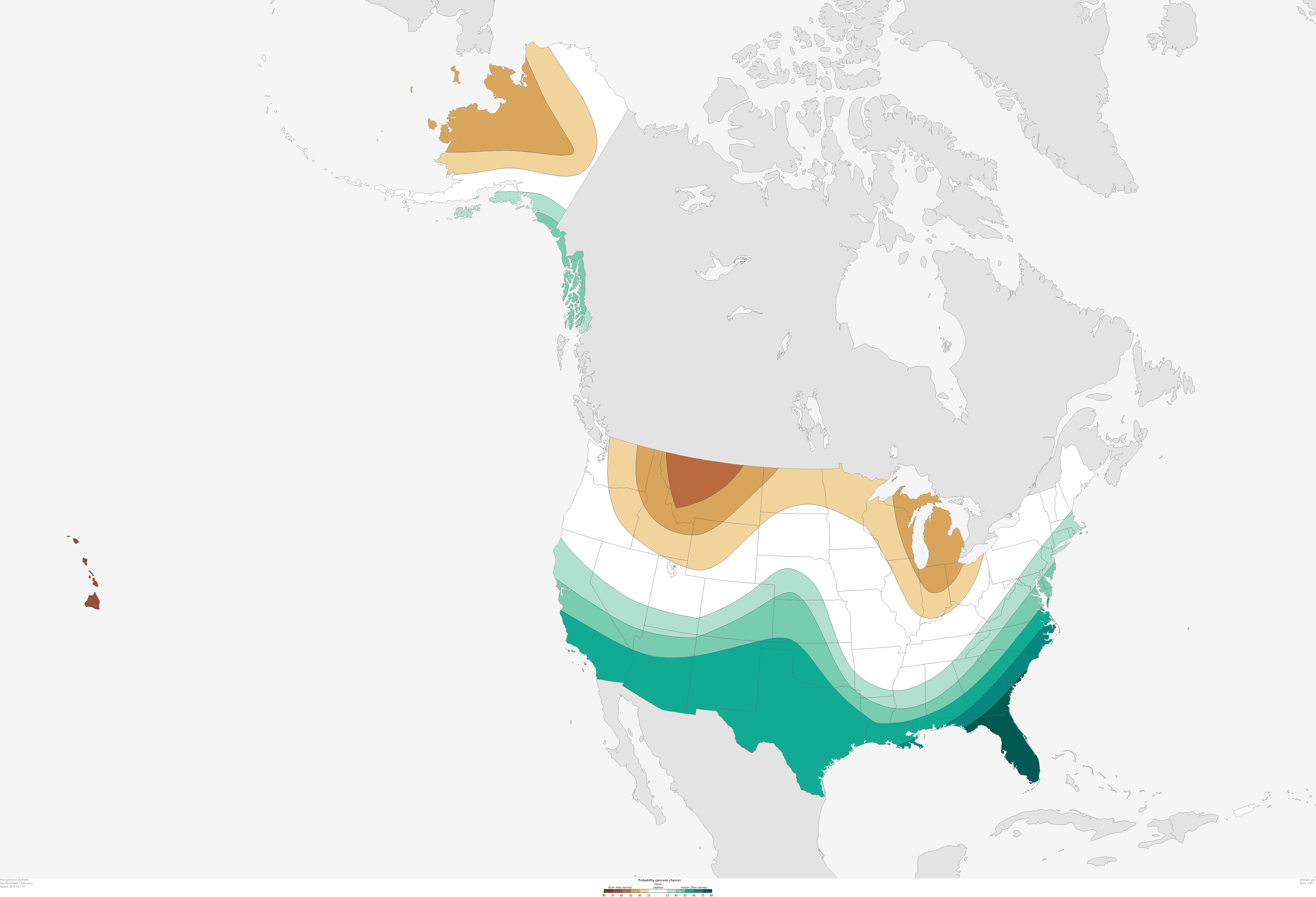 National precipitation outlook for December-February, issued October 15, 2015. Large version shows Alaska, Hawaii, and Puerto Rico. Colors indicate the probability of above- or below-average precipitation, not how far above or blow average the precipitation is likely to be. White indicates equal chances for any outcome—above-, below-, or near-normal precipitation—not a prediction of normal conditions. Map by NOAA Climate.gov, based on data from the Climate Prediction Center.