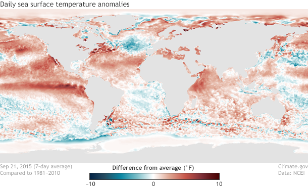 Sea surface temperatures on September 21, 2015, (smoothed by 7-day running mean) compared to the 1981-2010 average. NOAA Climate.gov map based on OISST data from NCEI. Entire time series for animation available on request.