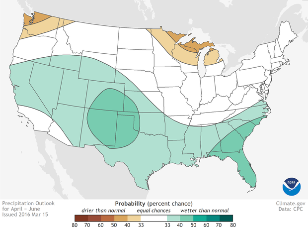 National precipitation outlook for April-June 2016. Large version shows Alaska, Hawaii, and Puerto Rico. Colors indicate the probability of above- or below-average precipitation, not how far above or blow average the precipitation is likely to be. White indicates equal chances for any outcome—above-, below-, or near-normal precipitation—not a prediction of "normal" conditions. Map by NOAA Climate.gov, based on data from the Climate Prediction Center.
