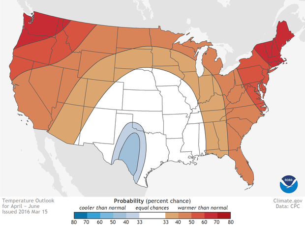 National temperature outlook for April-June 2016. Large version shows Alaska, Hawaii, and Puerto Rico. Colors indicate the probability of above- or below-average temperature, not how far above or blow average the temperature is likely to be. White indicates equal chances for any outcome—above-, below-, or near-normal temperature—not a prediction of "normal" conditions. Map by NOAA Climate.gov, based on data from the Climate Prediction Center.