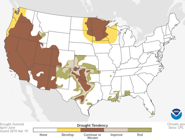 Predicted change in drought conditions across the United States for April-June 2015. Maps by NOAA Climate.gov, based on data provided by CPC.